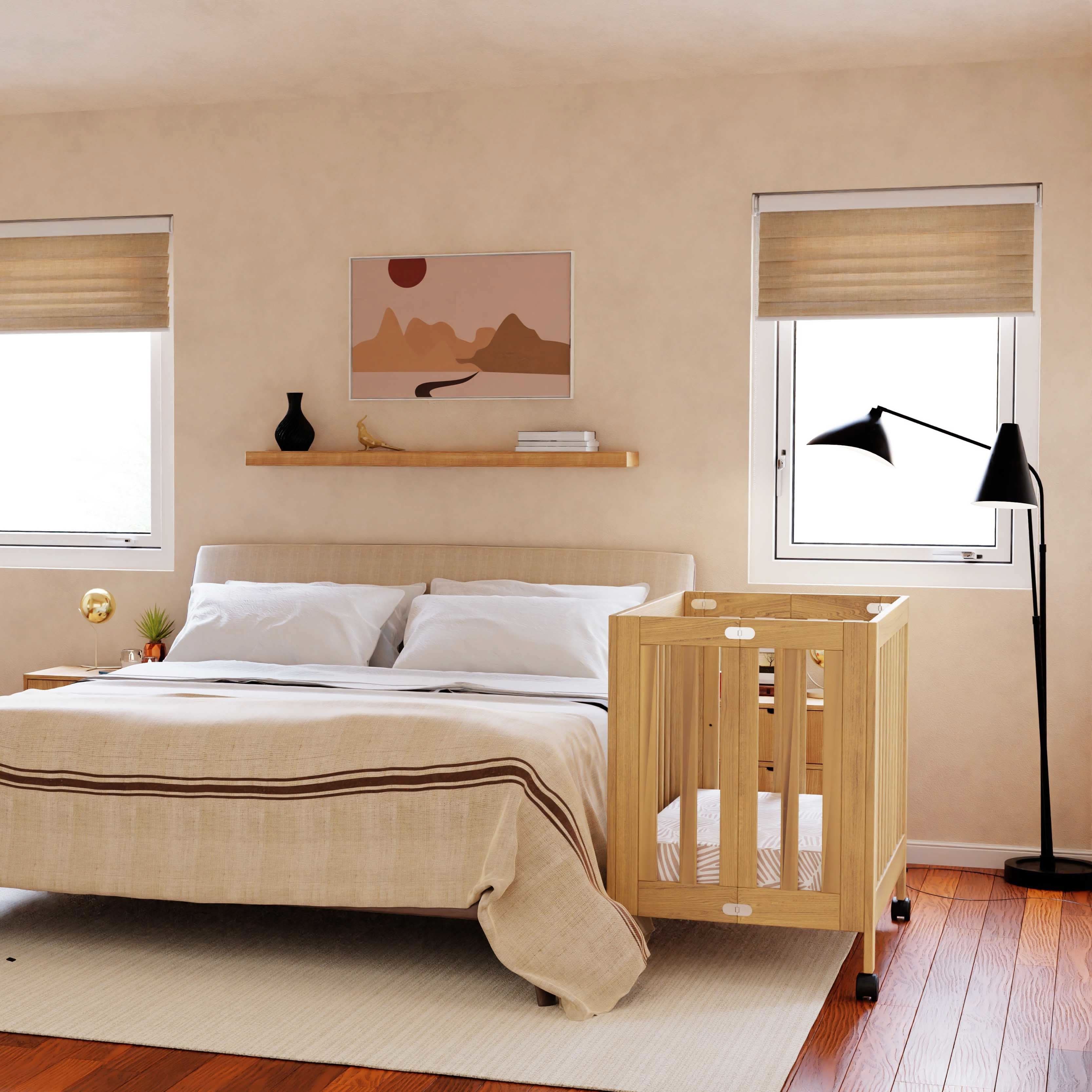 Meet Origami Mini Crib, the portable mini crib designed for modern families. The perfect mini crib for urban living or secondary living spaces, the Origami Mini's petite footprint and rolling feet allow for easy movement throughout the home, and will outlast a bassinet, providing a safe sleeping environment for your growing babe. With a folding mechanism for storage, the sustainable wood construction of the Origami Mini crib is both durable and lightweight. The Origami mini crib with wheels makes it easy for you to roll your baby from room to room so you can rest easy.Country of Origin: Taiwan (R.O.C.)