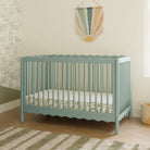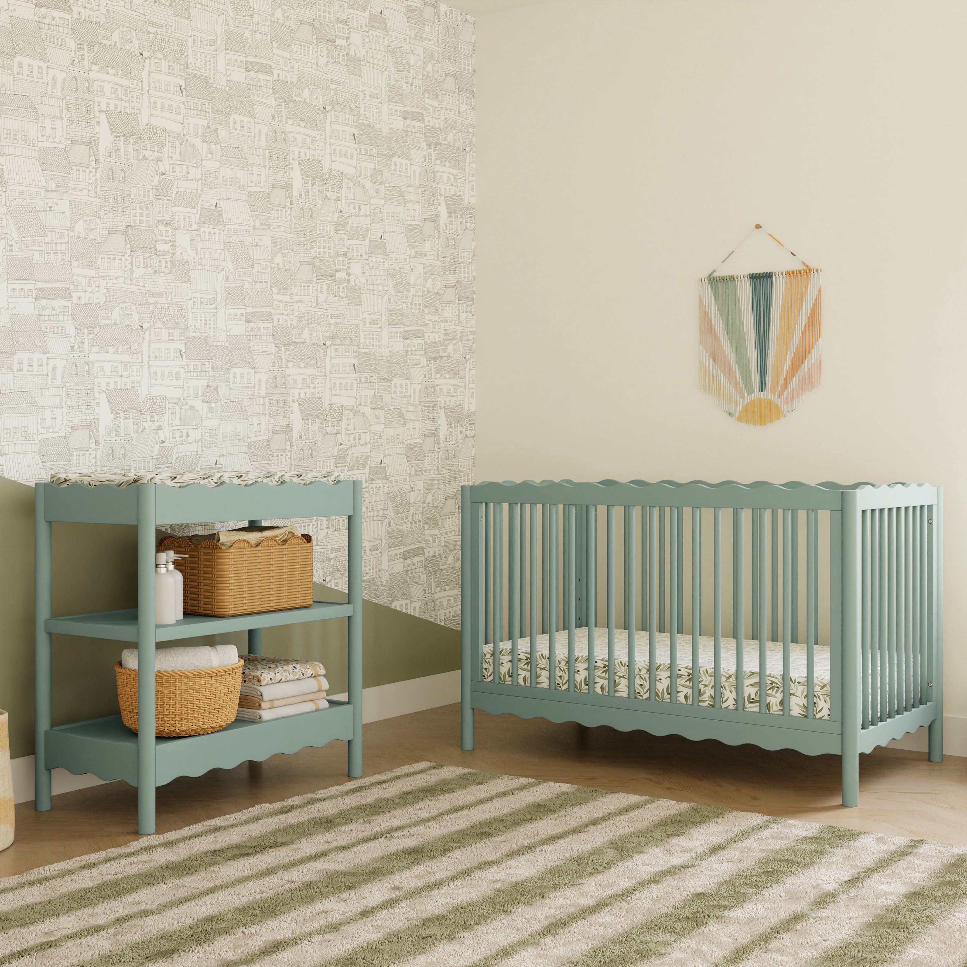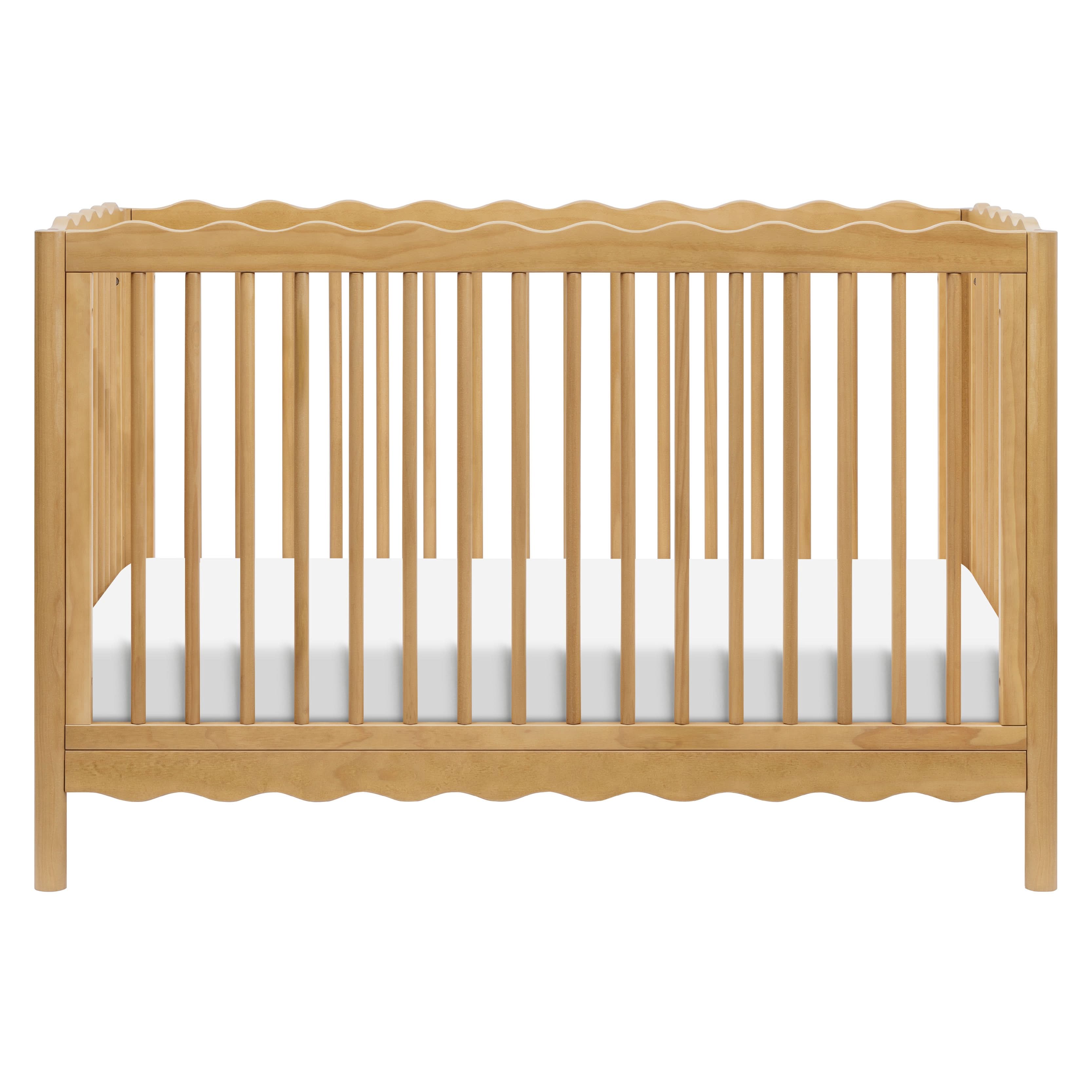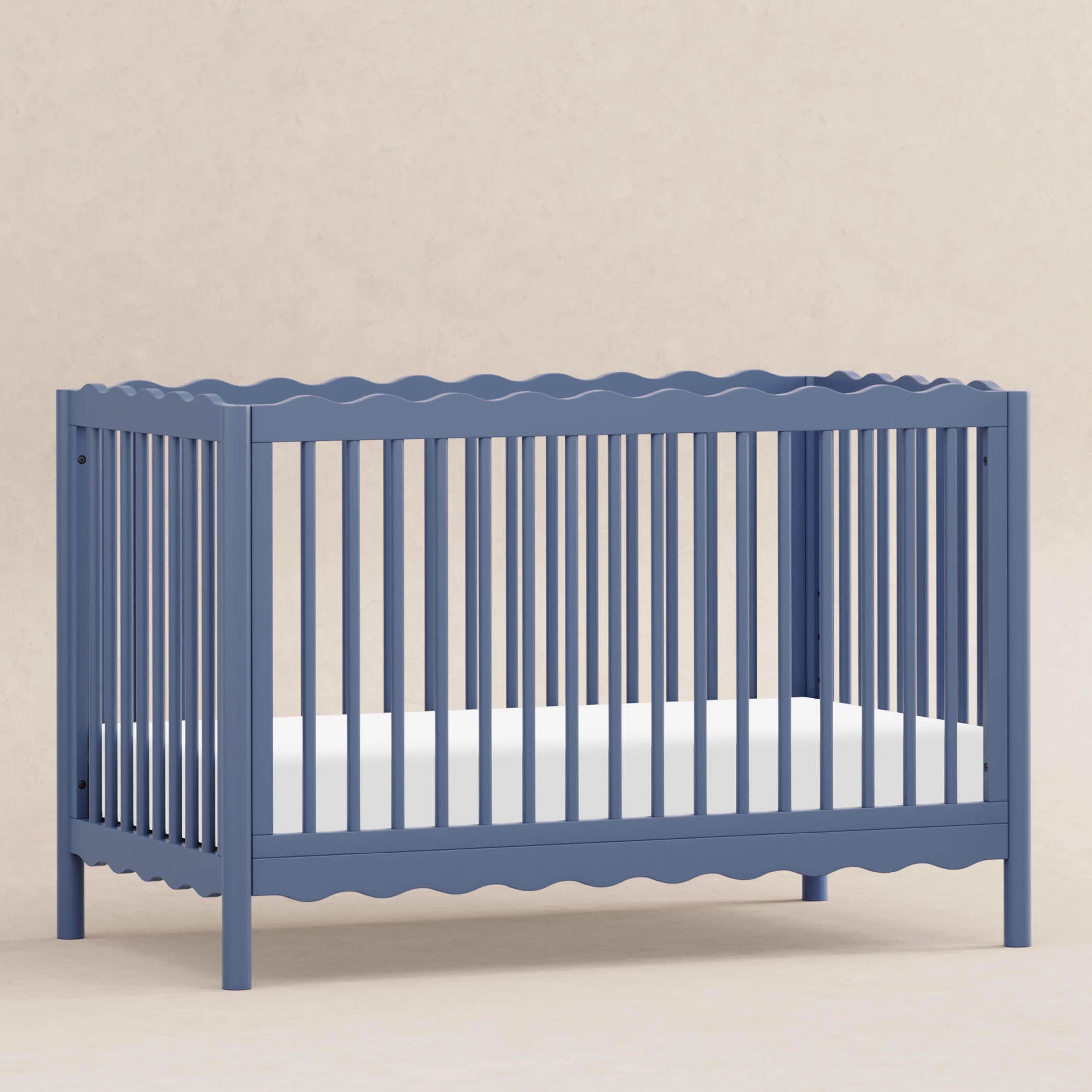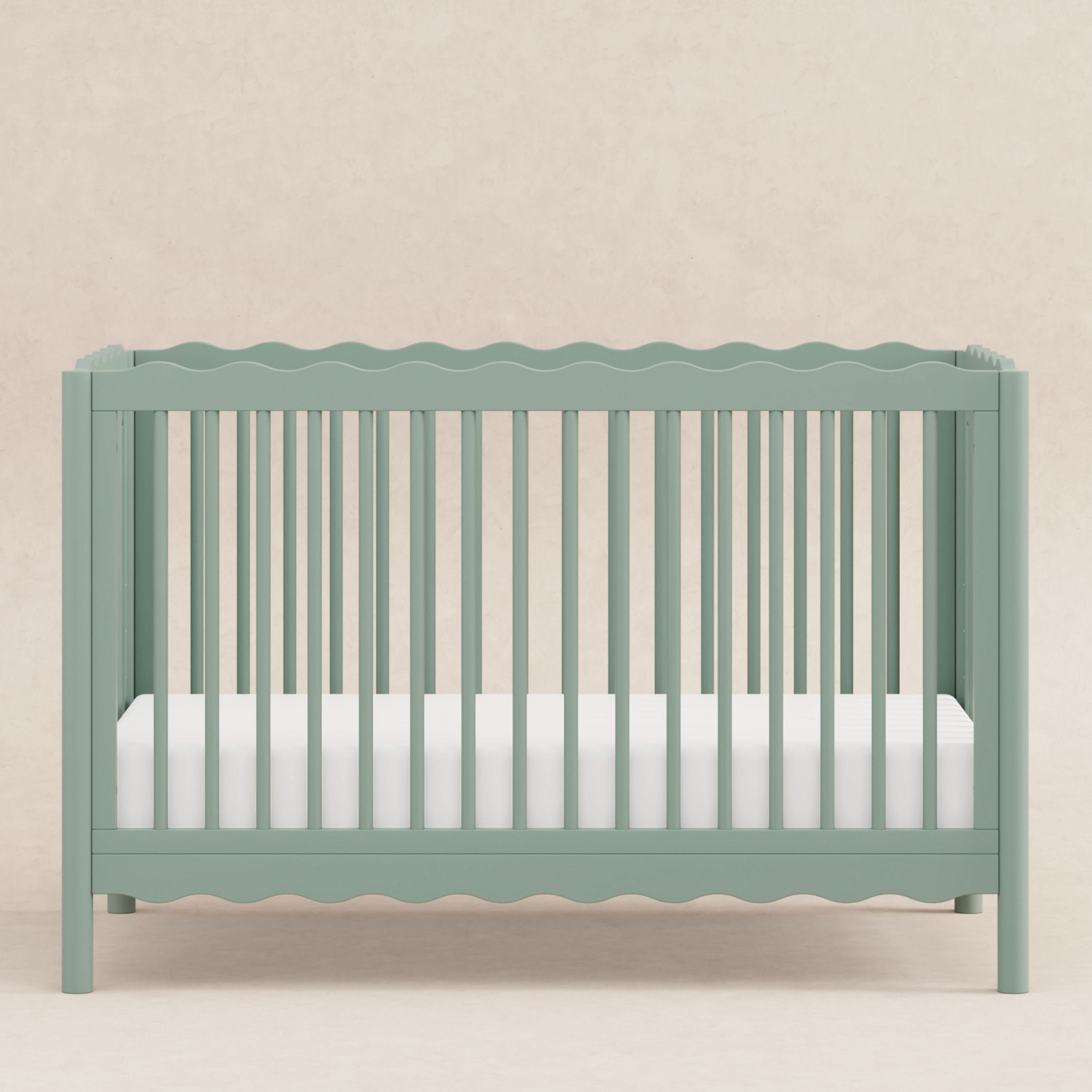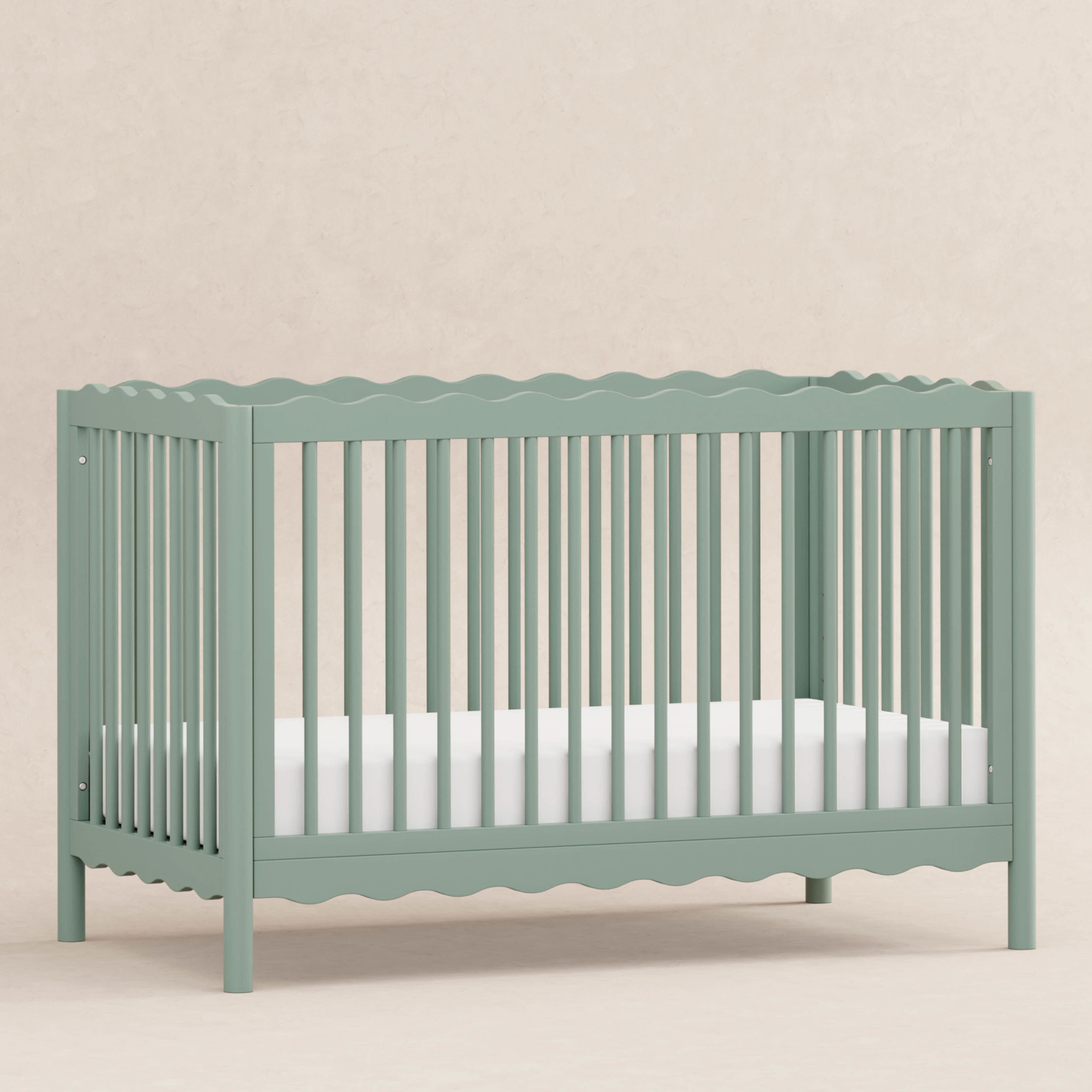 Dive into a world of playful charm with the Swell 4-in-1 Convertible Crib! Designed with wavy top and bottom railings inspired by the gentle undulations of ocean waves, this crib invokes the serene beauty of the sea and comes in a variety of colors to compliment any nursery. The Swell is made with FSC® certified sustainable New Zealand pine wood and screened for harmful chemicals to ensure it meets GREENGUARD GOLD Certification. An included toddler bed conversion kit allows you to seamlessly convert from crib to toddler bed to daybed with the option to add a full-sized bed conversion as you enter the big kid years.