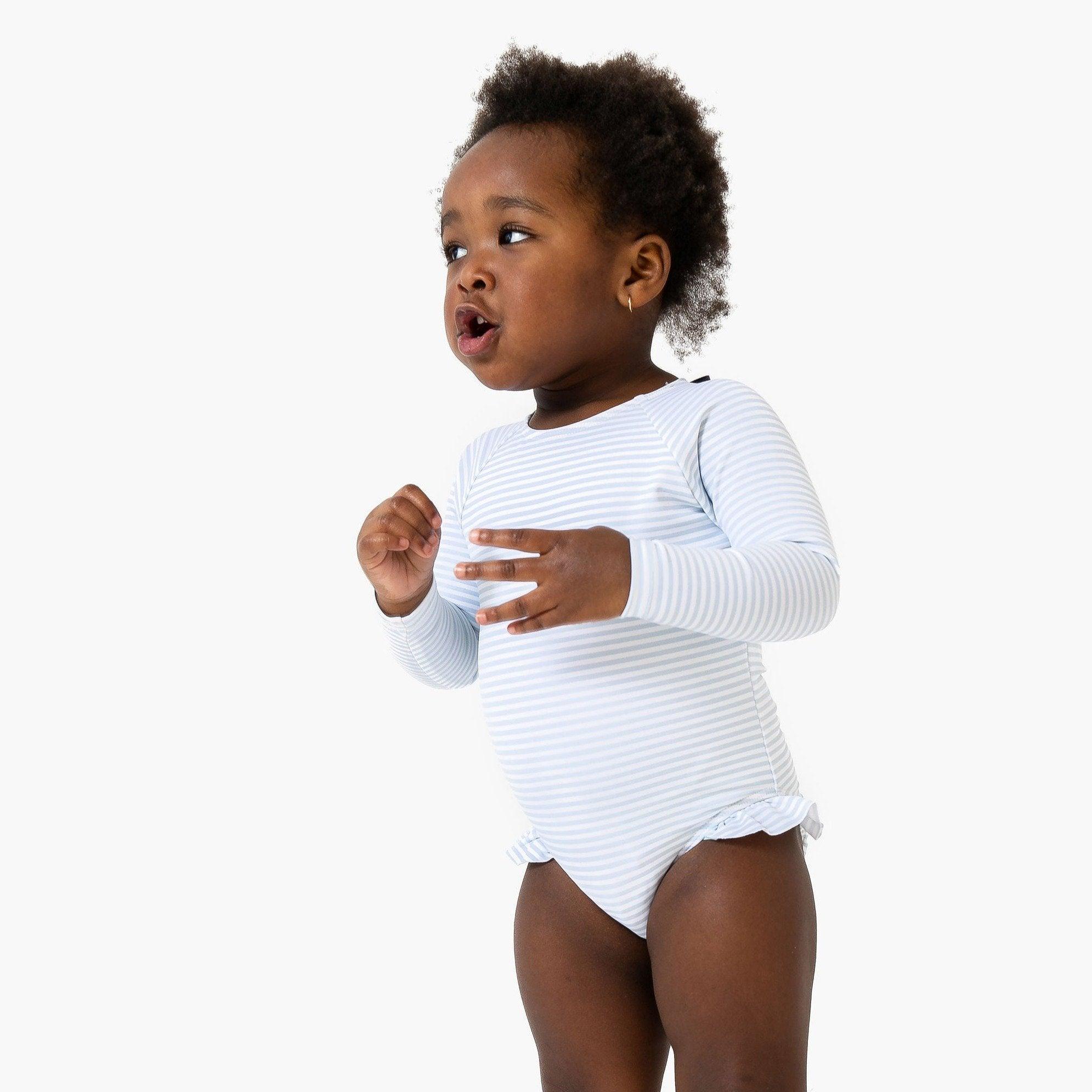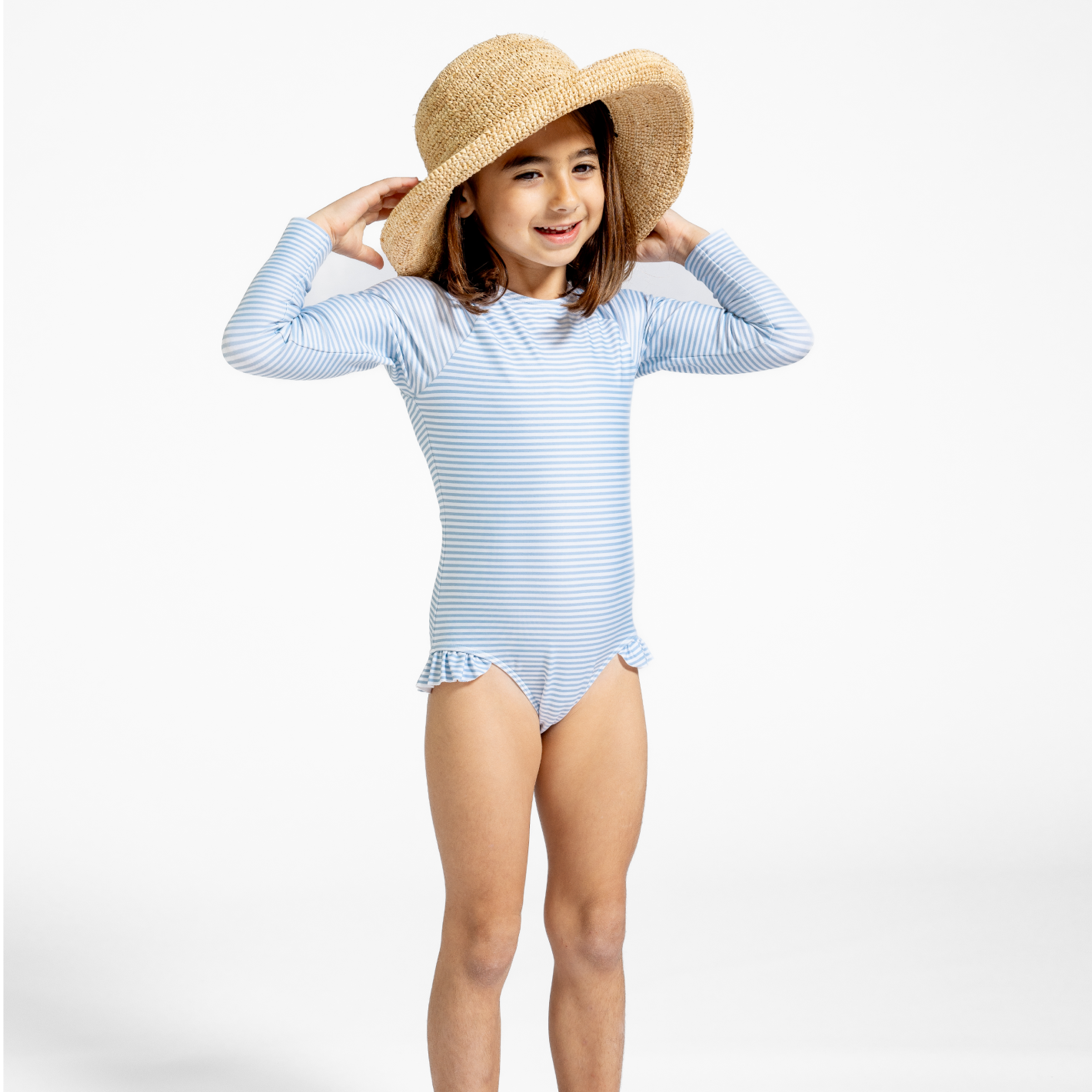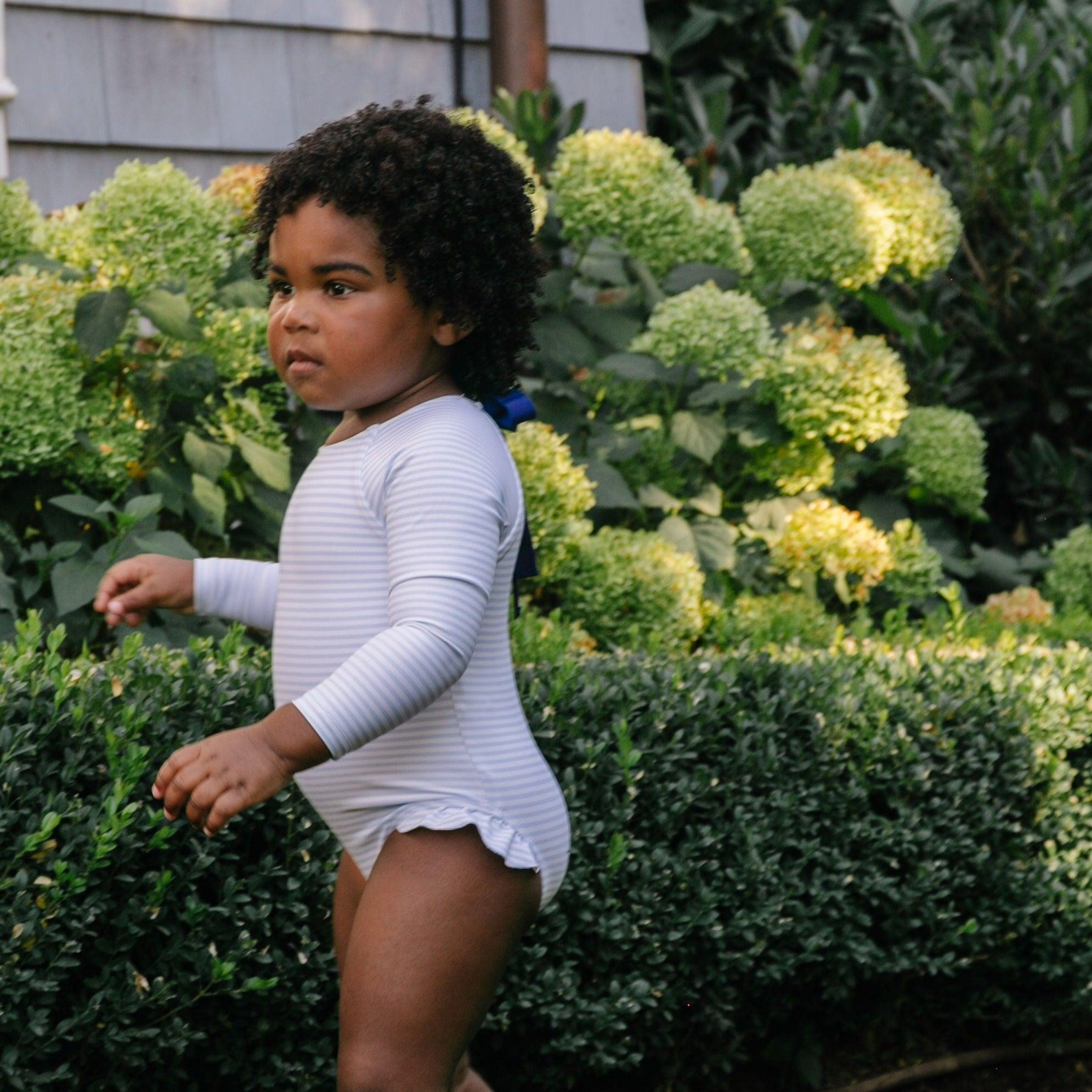 Our rashguard has been reimagined into an ultra-sweet one piece with a chic grosgrain ribbon tie back and feminine ruffle hip detail. In our buttery soft fabric with custom print, this long sleeved one piece is fully lined except for the sleeves to allow for movement and breathability. Designed for a complete look in one with UPF protection, this piece will help to keep your littles sun-safe.