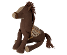 The brown pony is made in a soft cotton/linen fabric. The mane and tail is cotton strings and the saddle is made in soft knitted fabric that guarantees the ride will be comfortable.