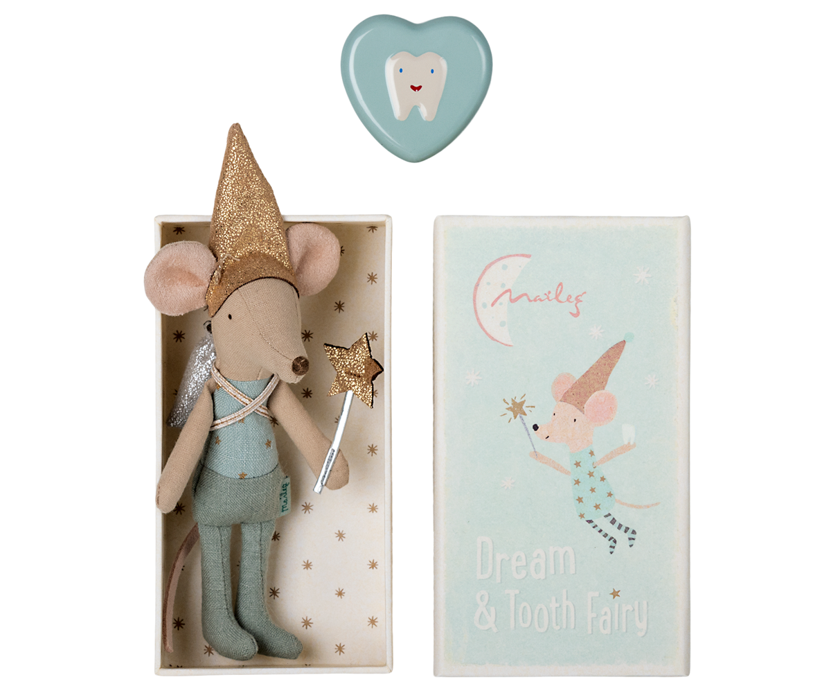 At night the tooth fairy spreads fairy dust, collects teeth, brings treats, and makes sure you have sweet dreams. Dressed magically in soft tones and with a shiny hat and a sparkly backpack, our friend also has a tooth box and a matchbox to rest.