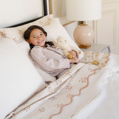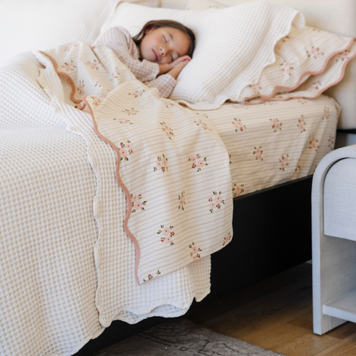 A soft, breathable cotton waffle knit coverlet set for kids, designed to bring comfort and quiet texture to children’s bedrooms. Lightweight and easy to layer, it’s the kind of bedding that works year round. The textured waffle weave, scalloped edge, and matching pillow sham(s) add details that feel special, while still keeping the room calm and timeless. Made for beds kids actually want to climb into.