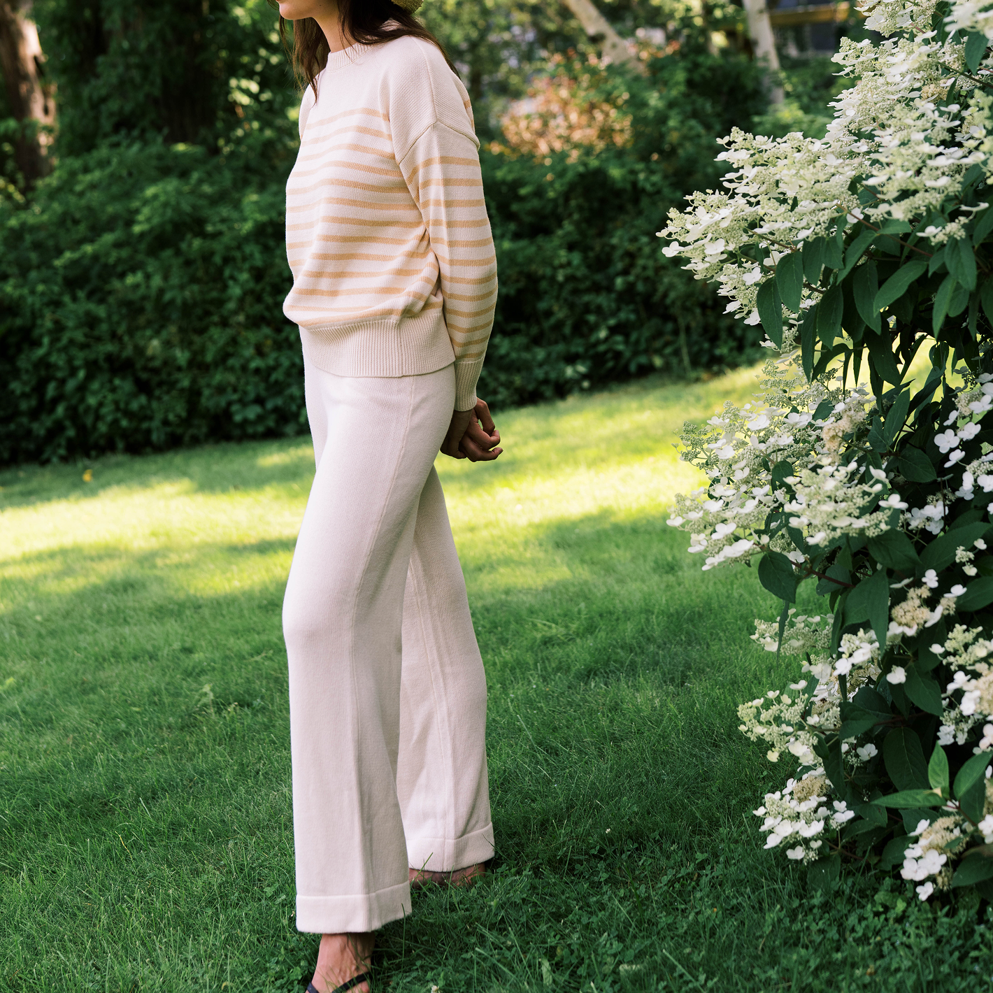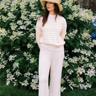 this premium knit pant takes elevated loungewear to a whole new level. with a casual, straight leg fit, it's as cozy as it is cute. the cotton-cashmere luxury knit is ultra-soft, perfect for sunset at the beach or relaxing at home. you'll want a pair for every day of the week! make it a set by pairing it with our classic breton stripe knit sweater.
